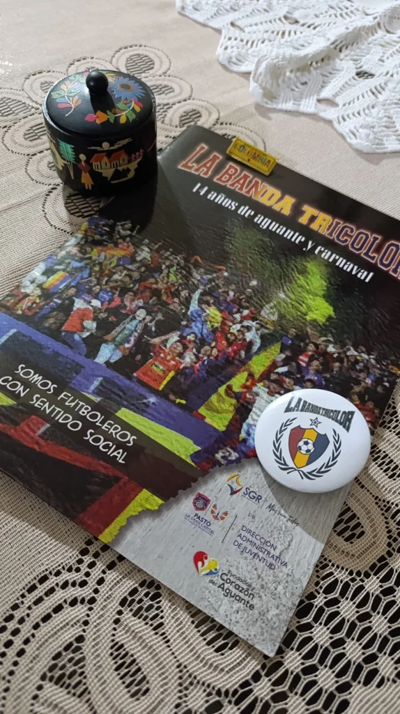 Foto de la Revista de La Banda Tricolor: 14 años de aguante y carnaval, a los lados cofre típico de la ciudad de Pasto y pin de la Barra Tricolor.
